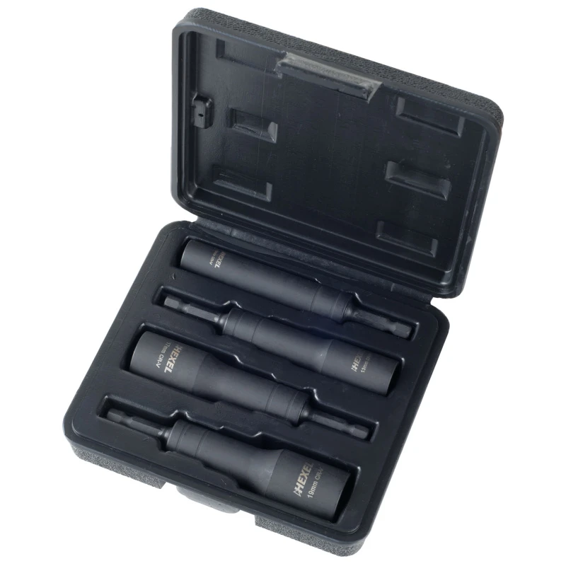 Coffret 4 douilles articulées pour boulons 6 pans Ø10 – 13 – 17 – 19 mm. Longueur douille: 115 mm. Inclinaison: 15°