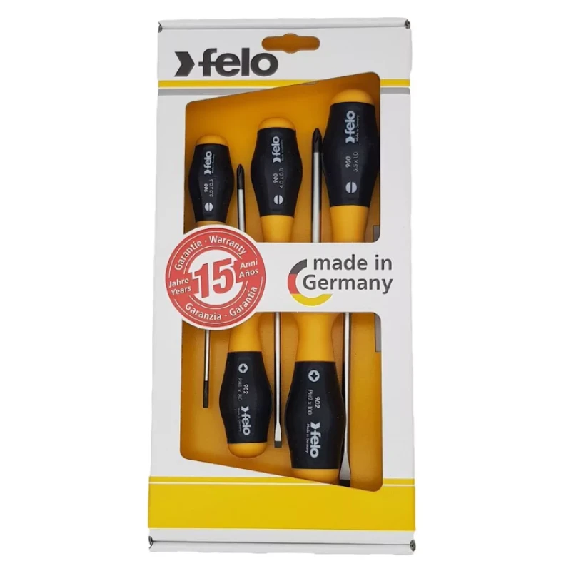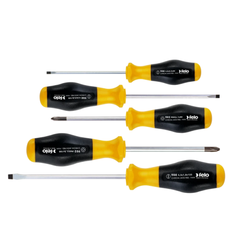 Qualité allemande. Le jeu est composé de : Tournevis fente 3×80, Tournevis fente 4.0×100, Tournevis fente 5.5×125, Tournevis PH1x80, Tournevis PH2x100.