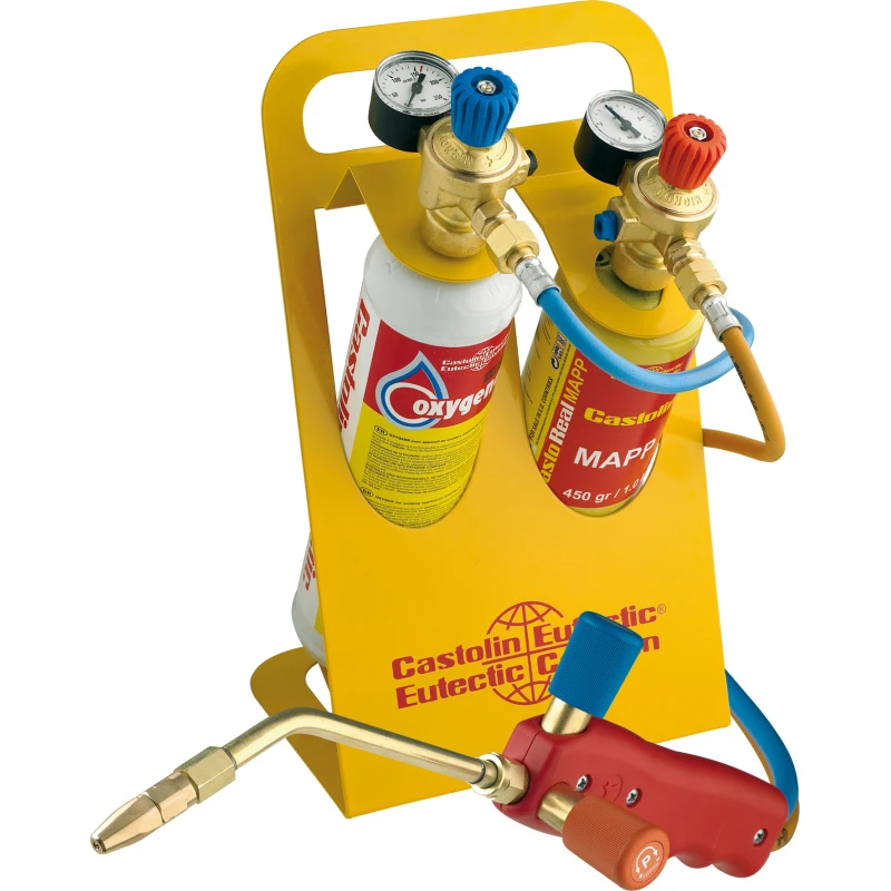 Chalumeau soudeur, équipé de sécurité intégrée avec poignée ergonomique, manodétendeur équipé d’anti retour pare flamme, détendeur équipé de manomètre permettant: Pour l’oxygène, une lecture de la pression restante dans la bouteille, pour le MAPP, le réglage précis de la pression d’utilisation, support métallique: transport facile et sécurisé.
